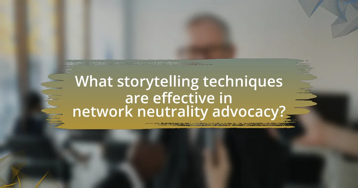 Effective storytelling techniques in network neutrality advocacy include personal narratives, data-driven storytelling, and the use of metaphors. Personal narratives engage audiences by illustrating real-life experiences affected by network neutrality issues, making the abstract concept relatable. Data-driven storytelling employs statistics and research findings to provide concrete evidence of the impact of network neutrality, enhancing credibility and urgency. Metaphors simplify complex ideas, allowing audiences to grasp the significance of network neutrality in everyday terms, such as comparing the internet to a public utility. These techniques collectively foster emotional connections and facilitate understanding, which are crucial for effective advocacy.