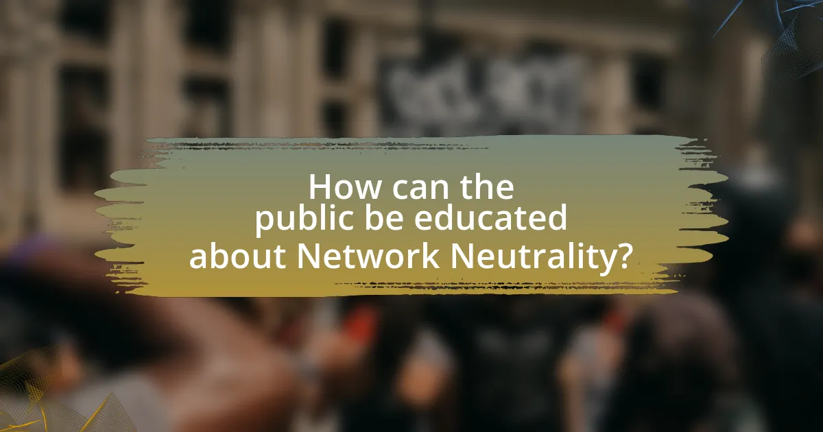 The public can be educated about Network Neutrality through targeted awareness campaigns, educational programs, and accessible online resources. Organizations such as the Electronic Frontier Foundation and the American Civil Liberties Union have developed materials that explain the principles of Network Neutrality, its importance for internet freedom, and the potential consequences of its absence. Additionally, community workshops and webinars can facilitate discussions and provide a platform for questions, enhancing understanding. Research indicates that informed citizens are more likely to engage in advocacy, as seen in the 2017 FCC public comments where over 22 million individuals expressed their views on Network Neutrality, demonstrating the impact of education on public participation in policy matters.