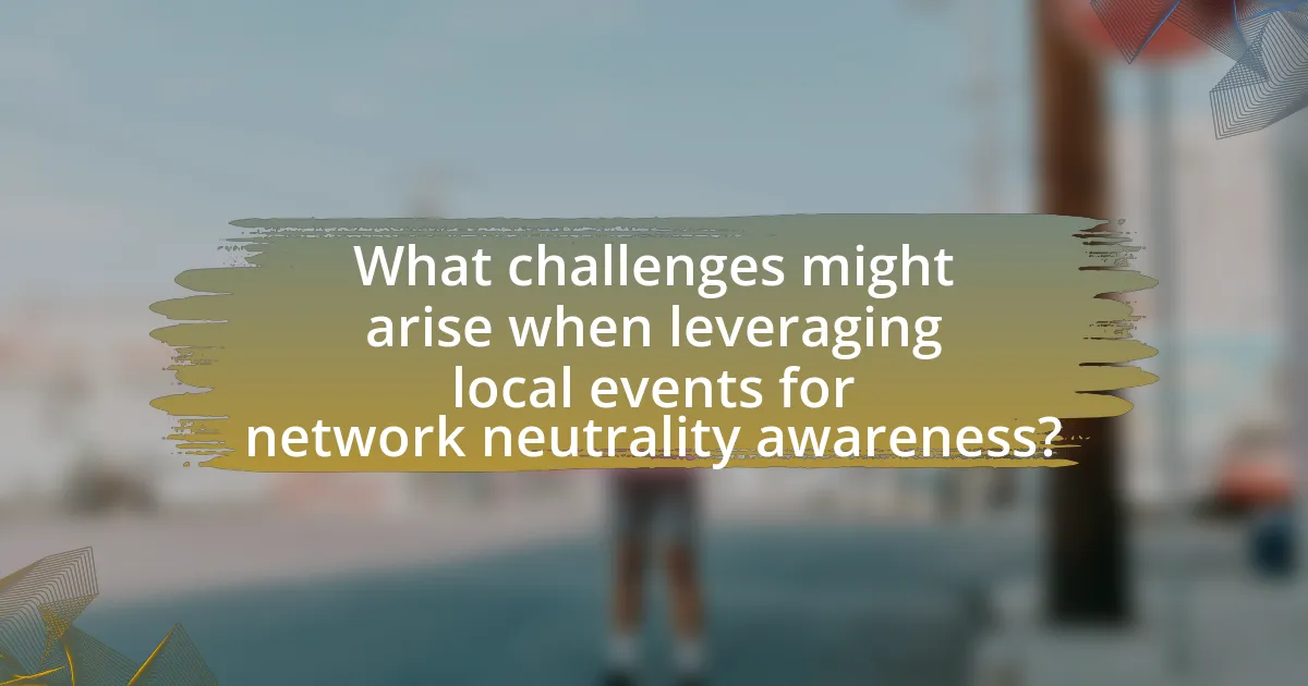 Challenges that might arise when leveraging local events for network neutrality awareness include limited audience reach, varying levels of public interest, and potential misinformation. Local events often attract a small, specific demographic, which may not represent the broader community’s views on network neutrality. Additionally, public interest can fluctuate based on competing local events or issues, leading to lower engagement. Misinformation can also spread easily in informal settings, undermining the intended message about network neutrality. These factors can hinder the effectiveness of local events in raising awareness and fostering informed discussions.