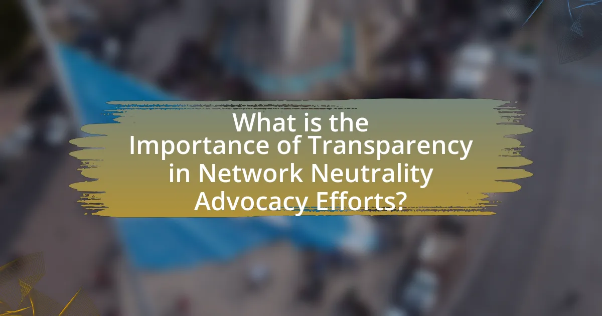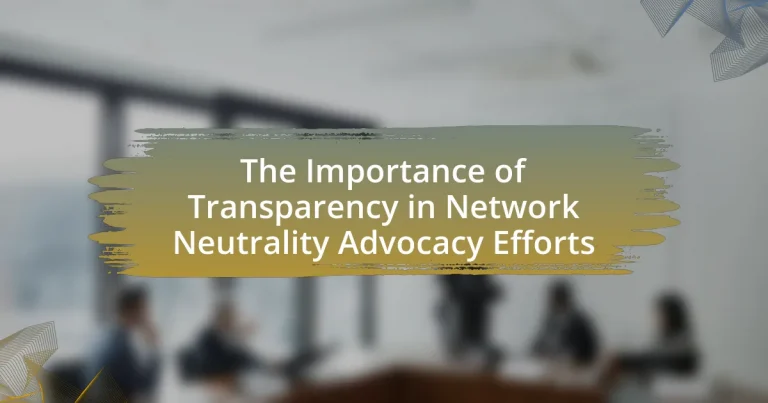 The article focuses on the significance of transparency in network neutrality advocacy efforts. It emphasizes that transparency fosters trust among stakeholders, including consumers, policymakers, and service providers, by providing clear information about objectives, funding sources, and decision-making processes. Key components of transparency, such as accountability and accessibility of information, are discussed, along with the impact of transparency on public perception, stakeholder engagement, and policy outcomes. The article also addresses challenges advocates face in maintaining transparency and offers practical steps to enhance transparency in advocacy efforts, highlighting its critical role in shaping effective network neutrality policies.